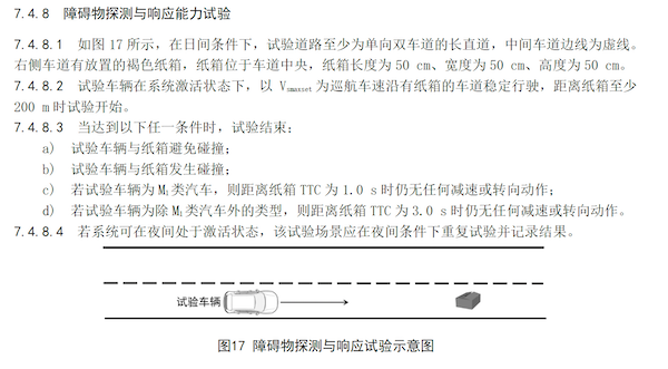 记者注意到,L2强制性国标中有两个试验场景,与“3·29铜陵小米SU7爆燃事故”发生时的场景高度相似,分别为7.4.7章节的“施工区域探测与响应能力试验”和7.5.8章节的“B类道路环境施工区域探测与响应能力试验”。示意图如下: