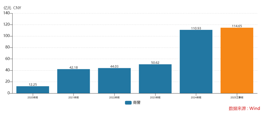 而且,迈瑞医疗长期以来依赖外延式并购驱动增长,这种发展战略在带来业务扩张的同时,也积累了巨大的商誉风险。根据公司财报,自2020年至今,不到6年时间,公司的商誉值扩张了近10倍。截至2025年三季度末,公司的商誉值高达114.65亿元,相较于2020年末的12.25亿元大增836%。
